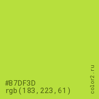 Цвет #B7DF3D в цветовой модели RGB обозначается тремя октетами (183, 223, 61) в десятичном формате и #B7DF3D в шестнадцатиричном (hex) формате, которые являются интенсивностью красного 183 (hex B7), интенсивность зелёного 223 (hex DF) и интенсивность синего 61 (hex 3D).