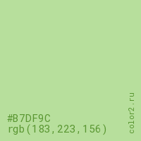 Цвет #B7DF9C в цветовой модели RGB обозначается тремя октетами (183, 223, 156) в десятичном формате и #B7DF9C в шестнадцатиричном (hex) формате, которые являются интенсивностью красного 183 (hex B7), интенсивность зелёного 223 (hex DF) и интенсивность синего 156 (hex 9C).
