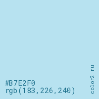 Цвет #B7E2F0 в цветовой модели RGB обозначается тремя октетами (183, 226, 240) в десятичном формате и #B7E2F0 в шестнадцатиричном (hex) формате, которые являются интенсивностью красного 183 (hex B7), интенсивность зелёного 226 (hex E2) и интенсивность синего 240 (hex F0).