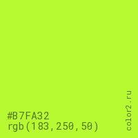 Цвет #B7FA32 в цветовой модели RGB обозначается тремя октетами (183, 250, 50) в десятичном формате и #B7FA32 в шестнадцатиричном (hex) формате, которые являются интенсивностью красного 183 (hex B7), интенсивность зелёного 250 (hex FA) и интенсивность синего 50 (hex 32).