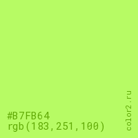 Цвет #B7FB64 в цветовой модели RGB обозначается тремя октетами (183, 251, 100) в десятичном формате и #B7FB64 в шестнадцатиричном (hex) формате, которые являются интенсивностью красного 183 (hex B7), интенсивность зелёного 251 (hex FB) и интенсивность синего 100 (hex 64).