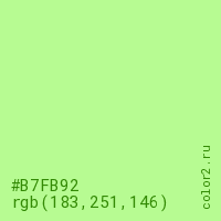 Цвет #B7FB92 в цветовой модели RGB обозначается тремя октетами (183, 251, 146) в десятичном формате и #B7FB92 в шестнадцатиричном (hex) формате, которые являются интенсивностью красного 183 (hex B7), интенсивность зелёного 251 (hex FB) и интенсивность синего 146 (hex 92).