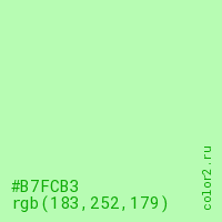 Цвет #B7FCB3 в цветовой модели RGB обозначается тремя октетами (183, 252, 179) в десятичном формате и #B7FCB3 в шестнадцатиричном (hex) формате, которые являются интенсивностью красного 183 (hex B7), интенсивность зелёного 252 (hex FC) и интенсивность синего 179 (hex B3).
