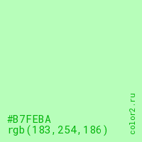 Цвет #B7FEBA в цветовой модели RGB обозначается тремя октетами (183, 254, 186) в десятичном формате и #B7FEBA в шестнадцатиричном (hex) формате, которые являются интенсивностью красного 183 (hex B7), интенсивность зелёного 254 (hex FE) и интенсивность синего 186 (hex BA).