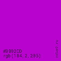 Цвет #B802CD в цветовой модели RGB обозначается тремя октетами (184, 2, 205) в десятичном формате и #B802CD в шестнадцатиричном (hex) формате, которые являются интенсивностью красного 184 (hex B8), интенсивность зелёного 2 (hex 02) и интенсивность синего 205 (hex CD).
