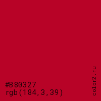 Цвет #B80327 в цветовой модели RGB обозначается тремя октетами (184, 3, 39) в десятичном формате и #B80327 в шестнадцатиричном (hex) формате, которые являются интенсивностью красного 184 (hex B8), интенсивность зелёного 3 (hex 03) и интенсивность синего 39 (hex 27).