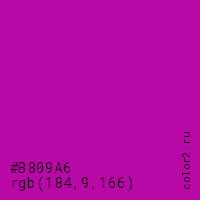Цвет #B809A6 в цветовой модели RGB обозначается тремя октетами (184, 9, 166) в десятичном формате и #B809A6 в шестнадцатиричном (hex) формате, которые являются интенсивностью красного 184 (hex B8), интенсивность зелёного 9 (hex 09) и интенсивность синего 166 (hex A6).
