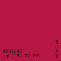 Цвет #B81645 в цветовой модели RGB обозначается тремя октетами (184, 22, 69) в десятичном формате и #B81645 в шестнадцатиричном (hex) формате, которые являются интенсивностью красного 184 (hex B8), интенсивность зелёного 22 (hex 16) и интенсивность синего 69 (hex 45).