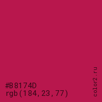 Цвет #B8174D в цветовой модели RGB обозначается тремя октетами (184, 23, 77) в десятичном формате и #B8174D в шестнадцатиричном (hex) формате, которые являются интенсивностью красного 184 (hex B8), интенсивность зелёного 23 (hex 17) и интенсивность синего 77 (hex 4D).