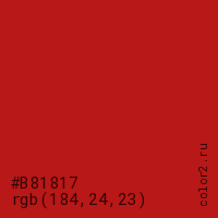 Цвет #B81817 в цветовой модели RGB обозначается тремя октетами (184, 24, 23) в десятичном формате и #B81817 в шестнадцатиричном (hex) формате, которые являются интенсивностью красного 184 (hex B8), интенсивность зелёного 24 (hex 18) и интенсивность синего 23 (hex 17).