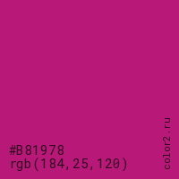 Цвет #B81978 в цветовой модели RGB обозначается тремя октетами (184, 25, 120) в десятичном формате и #B81978 в шестнадцатиричном (hex) формате, которые являются интенсивностью красного 184 (hex B8), интенсивность зелёного 25 (hex 19) и интенсивность синего 120 (hex 78).