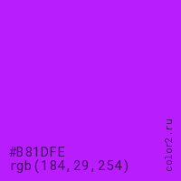 Цвет #B81DFE в цветовой модели RGB обозначается тремя октетами (184, 29, 254) в десятичном формате и #B81DFE в шестнадцатиричном (hex) формате, которые являются интенсивностью красного 184 (hex B8), интенсивность зелёного 29 (hex 1D) и интенсивность синего 254 (hex FE).