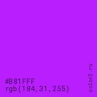 Цвет #B81FFF в цветовой модели RGB обозначается тремя октетами (184, 31, 255) в десятичном формате и #B81FFF в шестнадцатиричном (hex) формате, которые являются интенсивностью красного 184 (hex B8), интенсивность зелёного 31 (hex 1F) и интенсивность синего 255 (hex FF).