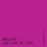 Цвет #B8218F в цветовой модели RGB обозначается тремя октетами (184, 33, 143) в десятичном формате и #B8218F в шестнадцатиричном (hex) формате, которые являются интенсивностью красного 184 (hex B8), интенсивность зелёного 33 (hex 21) и интенсивность синего 143 (hex 8F).