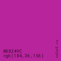 Цвет #B8249C в цветовой модели RGB обозначается тремя октетами (184, 36, 156) в десятичном формате и #B8249C в шестнадцатиричном (hex) формате, которые являются интенсивностью красного 184 (hex B8), интенсивность зелёного 36 (hex 24) и интенсивность синего 156 (hex 9C).