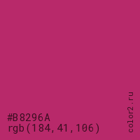 Цвет #B8296A в цветовой модели RGB обозначается тремя октетами (184, 41, 106) в десятичном формате и #B8296A в шестнадцатиричном (hex) формате, которые являются интенсивностью красного 184 (hex B8), интенсивность зелёного 41 (hex 29) и интенсивность синего 106 (hex 6A).