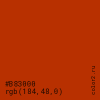 Цвет #B83000 в цветовой модели RGB обозначается тремя октетами (184, 48, 0) в десятичном формате и #B83000 в шестнадцатиричном (hex) формате, которые являются интенсивностью красного 184 (hex B8), интенсивность зелёного 48 (hex 30) и интенсивность синего 0 (hex 00).