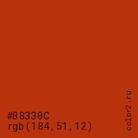 Цвет #B8330C в цветовой модели RGB обозначается тремя октетами (184, 51, 12) в десятичном формате и #B8330C в шестнадцатиричном (hex) формате, которые являются интенсивностью красного 184 (hex B8), интенсивность зелёного 51 (hex 33) и интенсивность синего 12 (hex 0C).