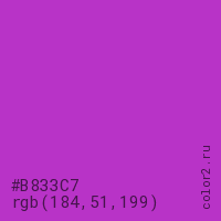 Цвет #B833C7 в цветовой модели RGB обозначается тремя октетами (184, 51, 199) в десятичном формате и #B833C7 в шестнадцатиричном (hex) формате, которые являются интенсивностью красного 184 (hex B8), интенсивность зелёного 51 (hex 33) и интенсивность синего 199 (hex C7).