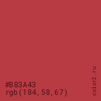 Цвет #B83A43 в цветовой модели RGB обозначается тремя октетами (184, 58, 67) в десятичном формате и #B83A43 в шестнадцатиричном (hex) формате, которые являются интенсивностью красного 184 (hex B8), интенсивность зелёного 58 (hex 3A) и интенсивность синего 67 (hex 43).