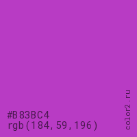 Цвет #B83BC4 в цветовой модели RGB обозначается тремя октетами (184, 59, 196) в десятичном формате и #B83BC4 в шестнадцатиричном (hex) формате, которые являются интенсивностью красного 184 (hex B8), интенсивность зелёного 59 (hex 3B) и интенсивность синего 196 (hex C4).
