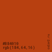 Цвет #B84010 в цветовой модели RGB обозначается тремя октетами (184, 64, 16) в десятичном формате и #B84010 в шестнадцатиричном (hex) формате, которые являются интенсивностью красного 184 (hex B8), интенсивность зелёного 64 (hex 40) и интенсивность синего 16 (hex 10).