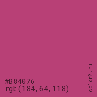 Цвет #B84076 в цветовой модели RGB обозначается тремя октетами (184, 64, 118) в десятичном формате и #B84076 в шестнадцатиричном (hex) формате, которые являются интенсивностью красного 184 (hex B8), интенсивность зелёного 64 (hex 40) и интенсивность синего 118 (hex 76).