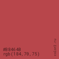 Цвет #B8464B в цветовой модели RGB обозначается тремя октетами (184, 70, 75) в десятичном формате и #B8464B в шестнадцатиричном (hex) формате, которые являются интенсивностью красного 184 (hex B8), интенсивность зелёного 70 (hex 46) и интенсивность синего 75 (hex 4B).