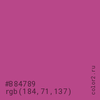 Цвет #B84789 в цветовой модели RGB обозначается тремя октетами (184, 71, 137) в десятичном формате и #B84789 в шестнадцатиричном (hex) формате, которые являются интенсивностью красного 184 (hex B8), интенсивность зелёного 71 (hex 47) и интенсивность синего 137 (hex 89).