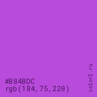Цвет #B84BDC в цветовой модели RGB обозначается тремя октетами (184, 75, 220) в десятичном формате и #B84BDC в шестнадцатиричном (hex) формате, которые являются интенсивностью красного 184 (hex B8), интенсивность зелёного 75 (hex 4B) и интенсивность синего 220 (hex DC).