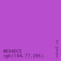 Цвет #B84DCE в цветовой модели RGB обозначается тремя октетами (184, 77, 206) в десятичном формате и #B84DCE в шестнадцатиричном (hex) формате, которые являются интенсивностью красного 184 (hex B8), интенсивность зелёного 77 (hex 4D) и интенсивность синего 206 (hex CE).