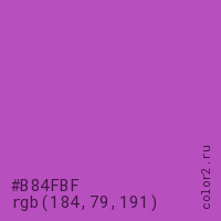 Цвет #B84FBF в цветовой модели RGB обозначается тремя октетами (184, 79, 191) в десятичном формате и #B84FBF в шестнадцатиричном (hex) формате, которые являются интенсивностью красного 184 (hex B8), интенсивность зелёного 79 (hex 4F) и интенсивность синего 191 (hex BF).