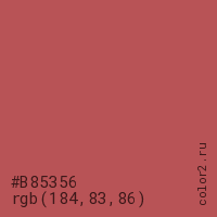 Цвет #B85356 в цветовой модели RGB обозначается тремя октетами (184, 83, 86) в десятичном формате и #B85356 в шестнадцатиричном (hex) формате, которые являются интенсивностью красного 184 (hex B8), интенсивность зелёного 83 (hex 53) и интенсивность синего 86 (hex 56).