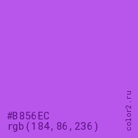 Цвет #B856EC в цветовой модели RGB обозначается тремя октетами (184, 86, 236) в десятичном формате и #B856EC в шестнадцатиричном (hex) формате, которые являются интенсивностью красного 184 (hex B8), интенсивность зелёного 86 (hex 56) и интенсивность синего 236 (hex EC).