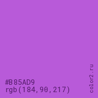 Цвет #B85AD9 в цветовой модели RGB обозначается тремя октетами (184, 90, 217) в десятичном формате и #B85AD9 в шестнадцатиричном (hex) формате, которые являются интенсивностью красного 184 (hex B8), интенсивность зелёного 90 (hex 5A) и интенсивность синего 217 (hex D9).