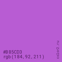 Цвет #B85CD3 в цветовой модели RGB обозначается тремя октетами (184, 92, 211) в десятичном формате и #B85CD3 в шестнадцатиричном (hex) формате, которые являются интенсивностью красного 184 (hex B8), интенсивность зелёного 92 (hex 5C) и интенсивность синего 211 (hex D3).