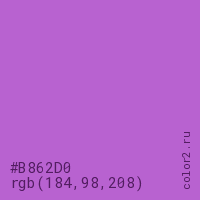 Цвет #B862D0 в цветовой модели RGB обозначается тремя октетами (184, 98, 208) в десятичном формате и #B862D0 в шестнадцатиричном (hex) формате, которые являются интенсивностью красного 184 (hex B8), интенсивность зелёного 98 (hex 62) и интенсивность синего 208 (hex D0).