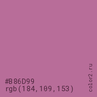 Цвет #B86D99 в цветовой модели RGB обозначается тремя октетами (184, 109, 153) в десятичном формате и #B86D99 в шестнадцатиричном (hex) формате, которые являются интенсивностью красного 184 (hex B8), интенсивность зелёного 109 (hex 6D) и интенсивность синего 153 (hex 99).