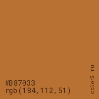 Цвет #B87033 в цветовой модели RGB обозначается тремя октетами (184, 112, 51) в десятичном формате и #B87033 в шестнадцатиричном (hex) формате, которые являются интенсивностью красного 184 (hex B8), интенсивность зелёного 112 (hex 70) и интенсивность синего 51 (hex 33).