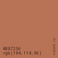 Цвет #B87256 в цветовой модели RGB обозначается тремя октетами (184, 114, 86) в десятичном формате и #B87256 в шестнадцатиричном (hex) формате, которые являются интенсивностью красного 184 (hex B8), интенсивность зелёного 114 (hex 72) и интенсивность синего 86 (hex 56).