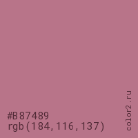 Цвет #B87489 в цветовой модели RGB обозначается тремя октетами (184, 116, 137) в десятичном формате и #B87489 в шестнадцатиричном (hex) формате, которые являются интенсивностью красного 184 (hex B8), интенсивность зелёного 116 (hex 74) и интенсивность синего 137 (hex 89).