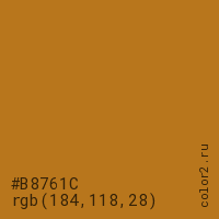 Цвет #B8761C в цветовой модели RGB обозначается тремя октетами (184, 118, 28) в десятичном формате и #B8761C в шестнадцатиричном (hex) формате, которые являются интенсивностью красного 184 (hex B8), интенсивность зелёного 118 (hex 76) и интенсивность синего 28 (hex 1C).
