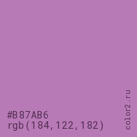 Цвет #B87AB6 в цветовой модели RGB обозначается тремя октетами (184, 122, 182) в десятичном формате и #B87AB6 в шестнадцатиричном (hex) формате, которые являются интенсивностью красного 184 (hex B8), интенсивность зелёного 122 (hex 7A) и интенсивность синего 182 (hex B6).