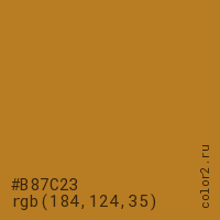 Цвет #B87C23 в цветовой модели RGB обозначается тремя октетами (184, 124, 35) в десятичном формате и #B87C23 в шестнадцатиричном (hex) формате, которые являются интенсивностью красного 184 (hex B8), интенсивность зелёного 124 (hex 7C) и интенсивность синего 35 (hex 23).