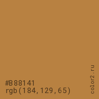 Цвет #B88141 в цветовой модели RGB обозначается тремя октетами (184, 129, 65) в десятичном формате и #B88141 в шестнадцатиричном (hex) формате, которые являются интенсивностью красного 184 (hex B8), интенсивность зелёного 129 (hex 81) и интенсивность синего 65 (hex 41).