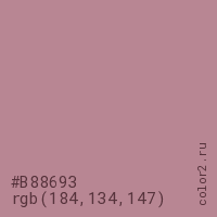 Цвет #B88693 в цветовой модели RGB обозначается тремя октетами (184, 134, 147) в десятичном формате и #B88693 в шестнадцатиричном (hex) формате, которые являются интенсивностью красного 184 (hex B8), интенсивность зелёного 134 (hex 86) и интенсивность синего 147 (hex 93).