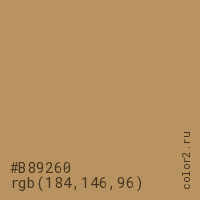 Цвет #B89260 в цветовой модели RGB обозначается тремя октетами (184, 146, 96) в десятичном формате и #B89260 в шестнадцатиричном (hex) формате, которые являются интенсивностью красного 184 (hex B8), интенсивность зелёного 146 (hex 92) и интенсивность синего 96 (hex 60).