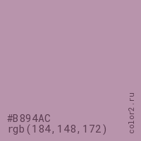 Цвет #B894AC в цветовой модели RGB обозначается тремя октетами (184, 148, 172) в десятичном формате и #B894AC в шестнадцатиричном (hex) формате, которые являются интенсивностью красного 184 (hex B8), интенсивность зелёного 148 (hex 94) и интенсивность синего 172 (hex AC).