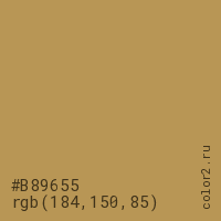 Цвет #B89655 в цветовой модели RGB обозначается тремя октетами (184, 150, 85) в десятичном формате и #B89655 в шестнадцатиричном (hex) формате, которые являются интенсивностью красного 184 (hex B8), интенсивность зелёного 150 (hex 96) и интенсивность синего 85 (hex 55).