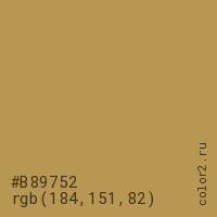 Цвет #B89752 в цветовой модели RGB обозначается тремя октетами (184, 151, 82) в десятичном формате и #B89752 в шестнадцатиричном (hex) формате, которые являются интенсивностью красного 184 (hex B8), интенсивность зелёного 151 (hex 97) и интенсивность синего 82 (hex 52).